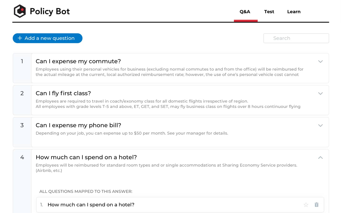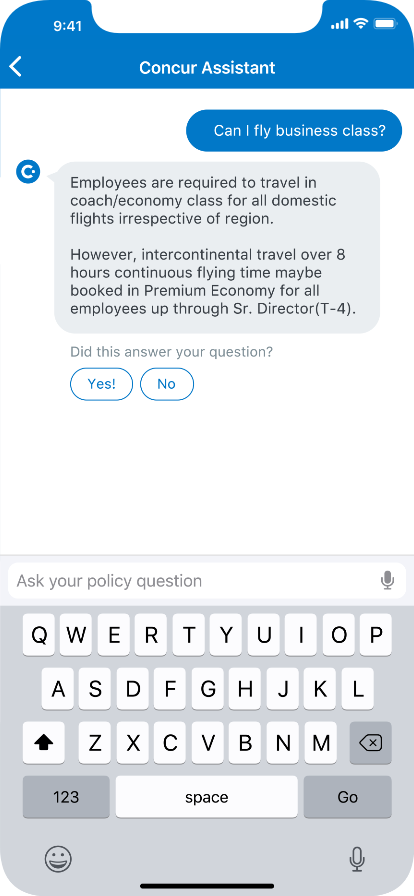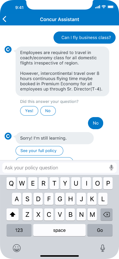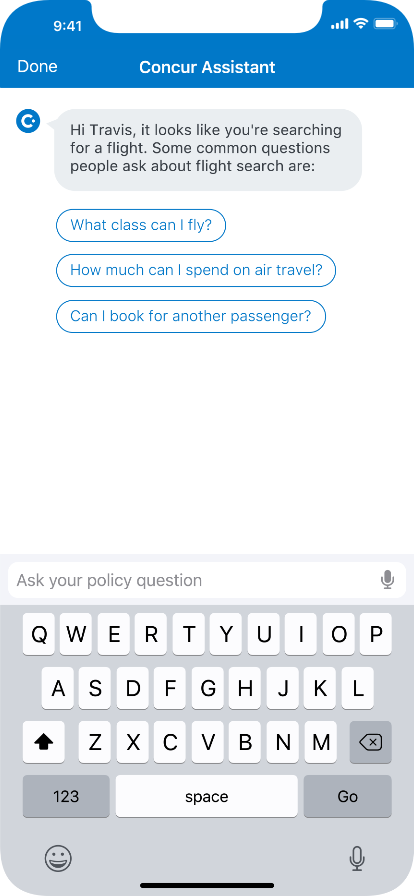 And as this started as just a way to help users answer policy questions, we eventually want to turn it into more of a genral contextual help system. This way if the user is in the middle of booking a flight and they pull up the Assistant, they'll get relevant question right off the bat pertaining to booking airfare. Also, we have hopes of someday personalizing the Assistant so it knows specifically what your personal policy is and not just a generic company policy. We found that for many companies the policy may change from person to person or role to role.
