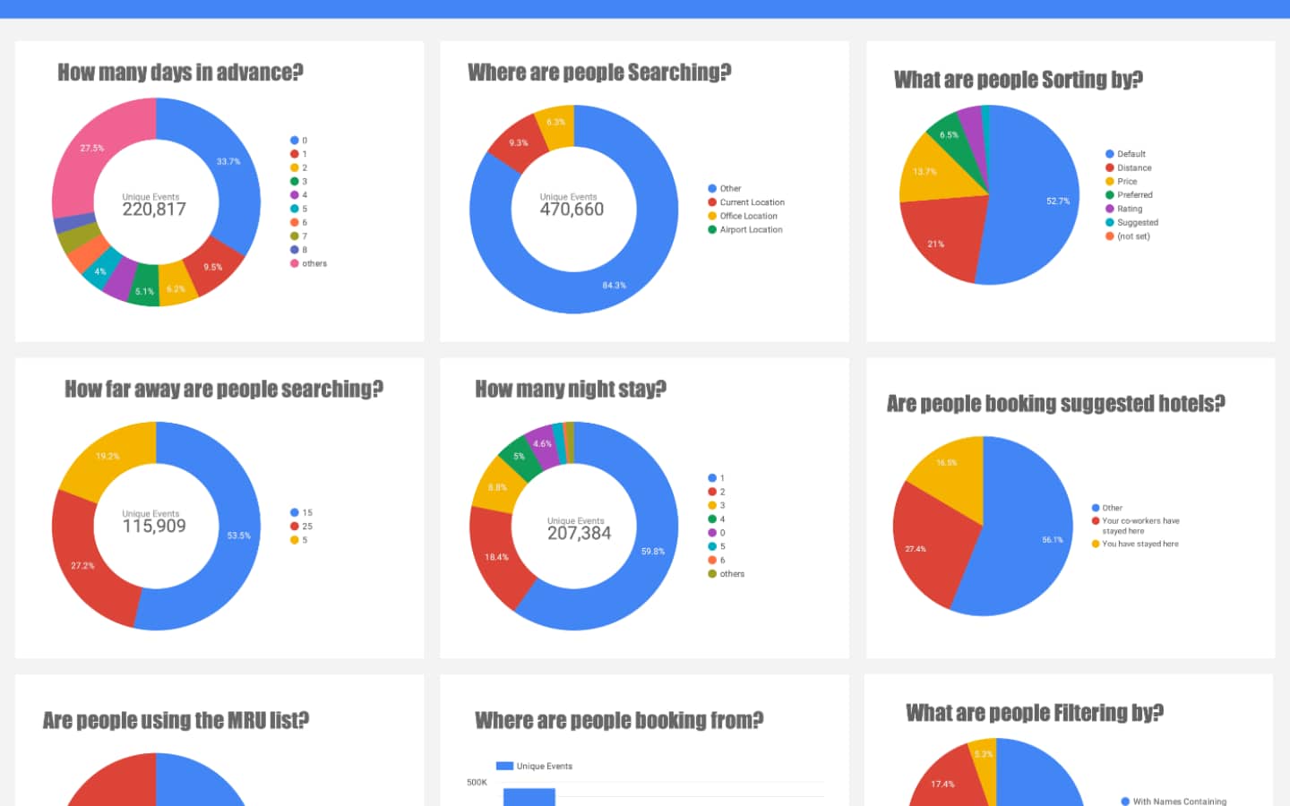I created a number of GA dashhbaords that displayed everything from number of bookings to how well our recommendations were doing. These ended up informing a number of later decisions we made both with the design and the product in general.