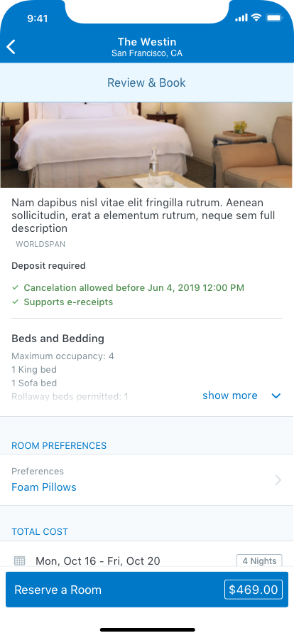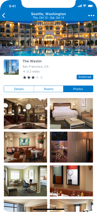 Upon hotel selection, we show the rooms, hotel details and photos all in their own tab - defaulting to the rooms tab. From here the user is also able to access the map and see how far the hotel is from any of their office locations, check out photos of the property, or just select a room for booking.