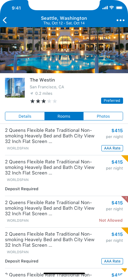 One of the big selling points of the Concur travel solution is overlaying policy on the search results. However, we found out that for the heavy business traveller (out mobile persona), policy wasn't as important. We decided to compromise by adding the "dog ear" to the the results to display policy violations. This way, the user can see what's in policy at a glance, but the screen isn't cluttered up with a bunch of icons and descriptions all at the same time.