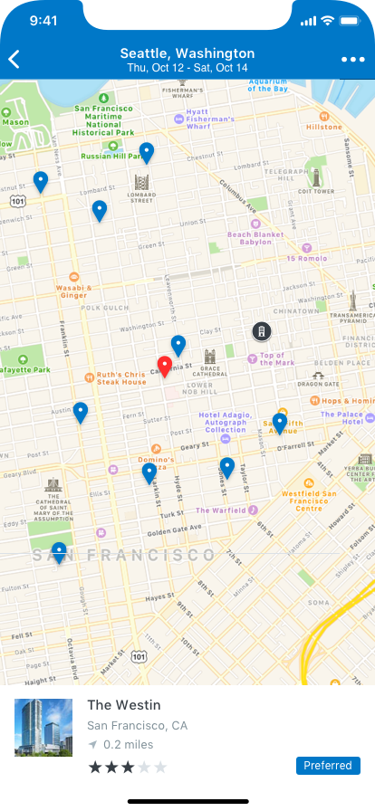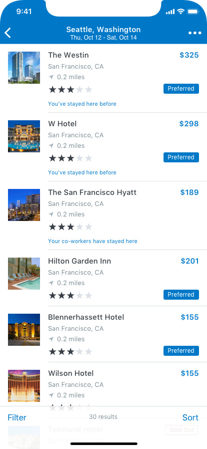 Due to some limitations, we were unable to bring back prices for all of the hotel results immediately - we could only price the first 10. In order to mitigate this, we made a hypothesis that the frequent business traveler (our persona) would want to either stay at the same place they're used to staying, or stay somewhere a colleague is staying. So the first 5 search results for any given location consists of any place you've stayed before first, then any place co-workers have stayed, and then the most popular places after that. Checking the analytics confirmed our hypothesis with 80% of users choosing from the top of the list.