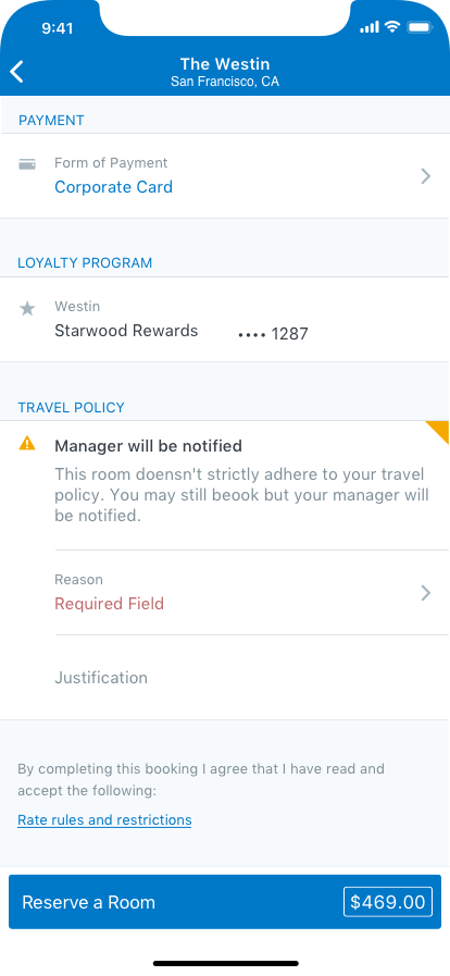 Redesigning the hotel booking flow was my first responsibility when I joined Concur. After the new flow and design was tested, we did a short internal beta and then released to the public. Unfortunately, none of this was instrumented for analytics before we re-built it so we don't have any metrics on if we improved time on task, conversion, engagement, customer sat, etc. However, we have increased number of bookings over the past year from
